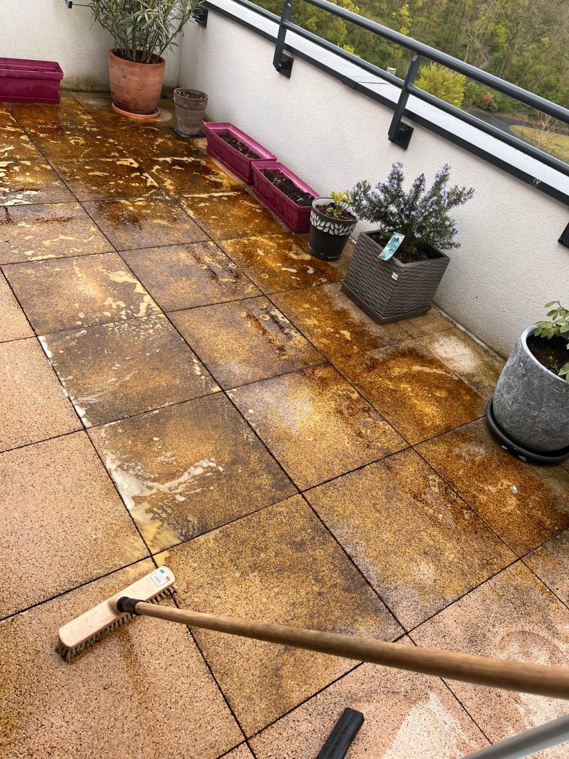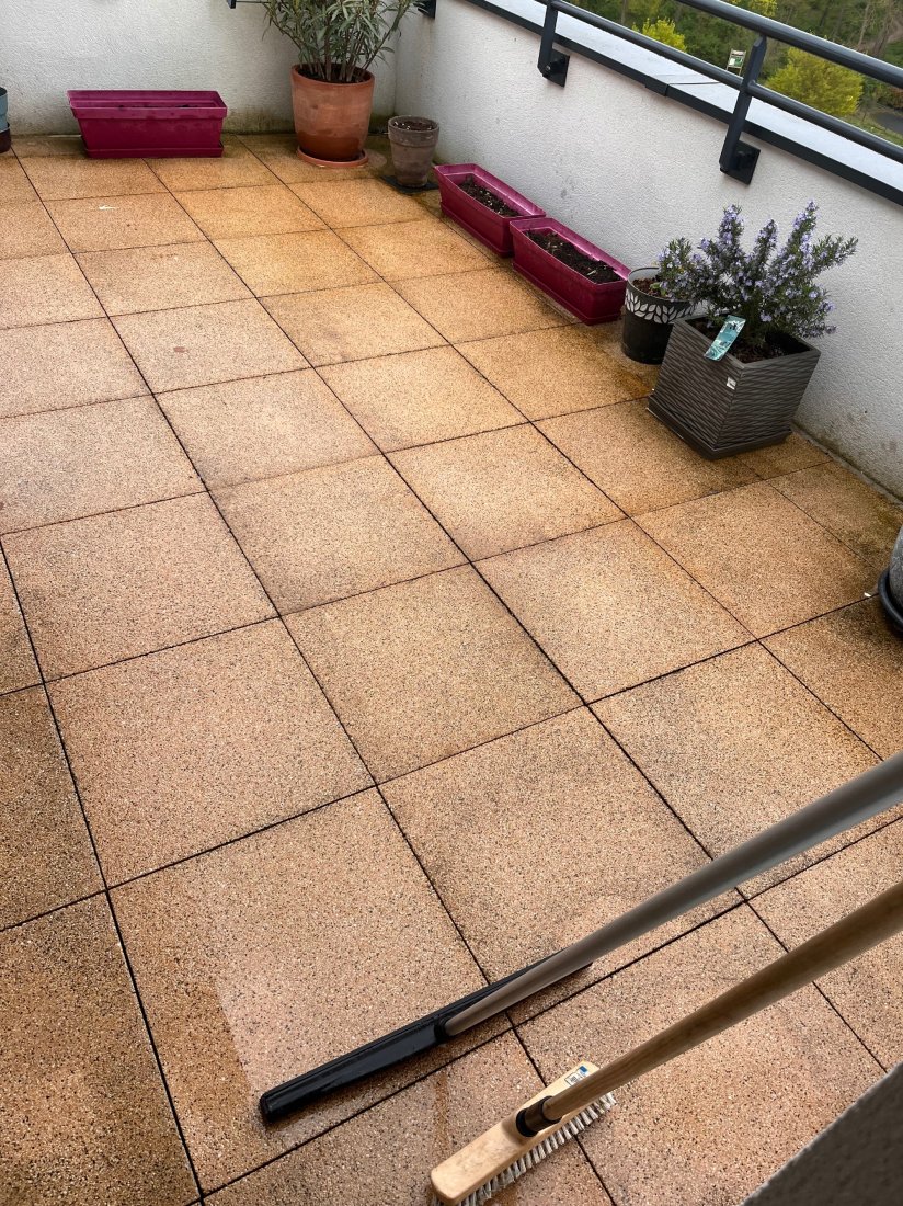 Photo d’une terrasse soigneusement nettoyée par BGLA SERVICES : les dalles retrouvent leur éclat, débarrassées des mousses et saletés, pour un espace extérieur propre, sain et accueillant.